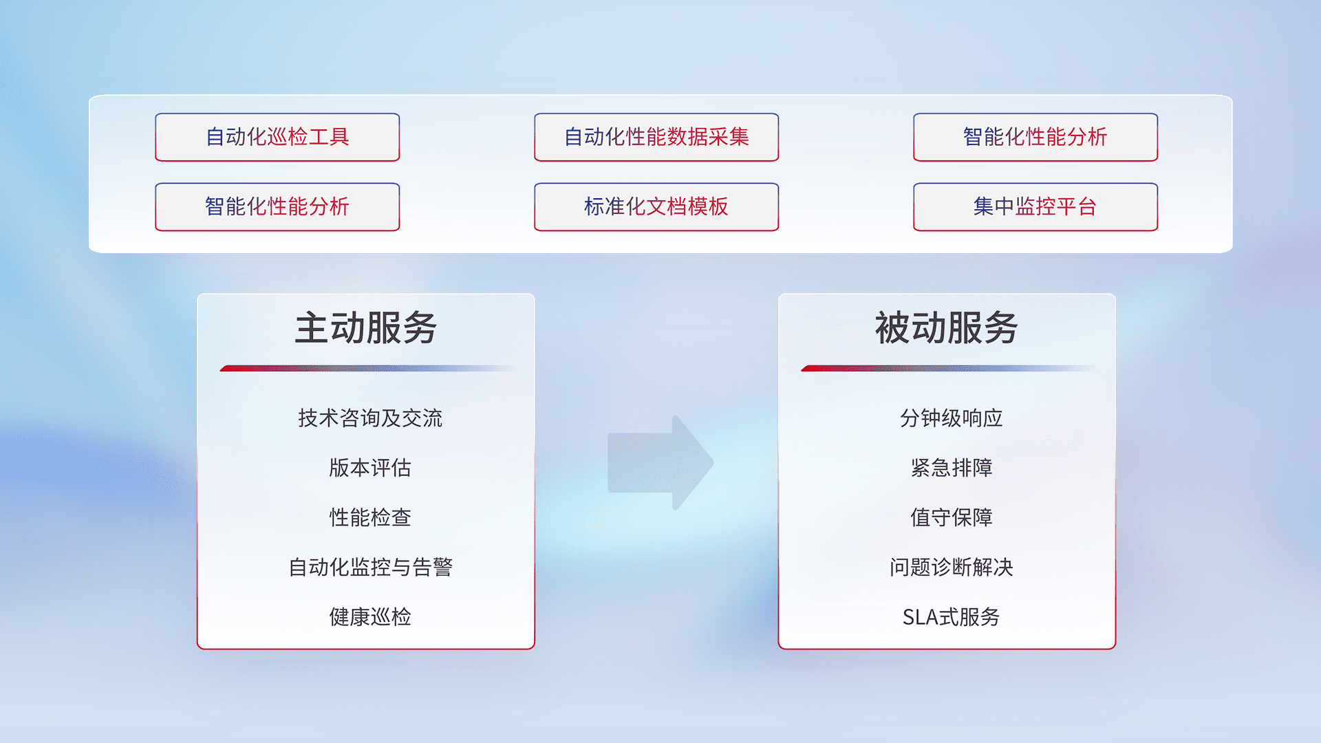 智能化工具和标准化文档,,保障服务质量,,提供主动服务(包含技术咨询、、、、版本评估、、、、性能检查、、自动化监控与告警、、健康巡检)和被动服务包含(分钟级响应、、、紧急排障、、、、值守保障、、、问题诊断解决、、、SLA服务)。。